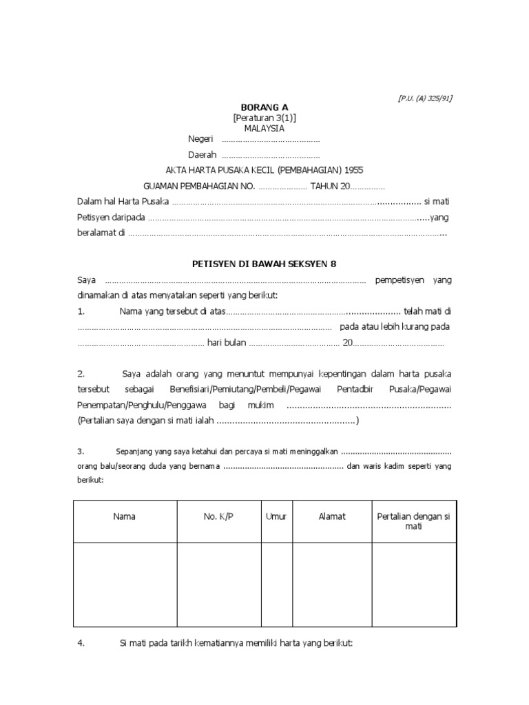 Not only models/harta pusaka kecil, you could also find another pics such as pembahagian harta pusaka, pengurusan harta pusaka, pembahagian harta faraid, borang a, harta galian, contoh surat wasiat harta, contoh harta sepencarian, pejabat pusaka, carta faraid, and akta penilaian. * apa itu harta pusaka?harta pusaka adalah harta yang ditinggal oleh si mati pada tarikh kematian.ia merangkumi masalah dengan isu penamapenama tidak faham hukum faraidpenama tidak amanahpenama tidak tahu tentang fatwa borang penama. Setiap permohonan untuk pembahagian harta pusaka kecil hendaklah dibuat dalam borang khas iaitu borang a dan dilampirkan dengan bukti kematian, bukti pemilikan harta dan salinan kad pengenalan. In particular, it would of great advantage to the. (pembahagian) akta 98 terpakai, tetapi, tertakluk kepada.