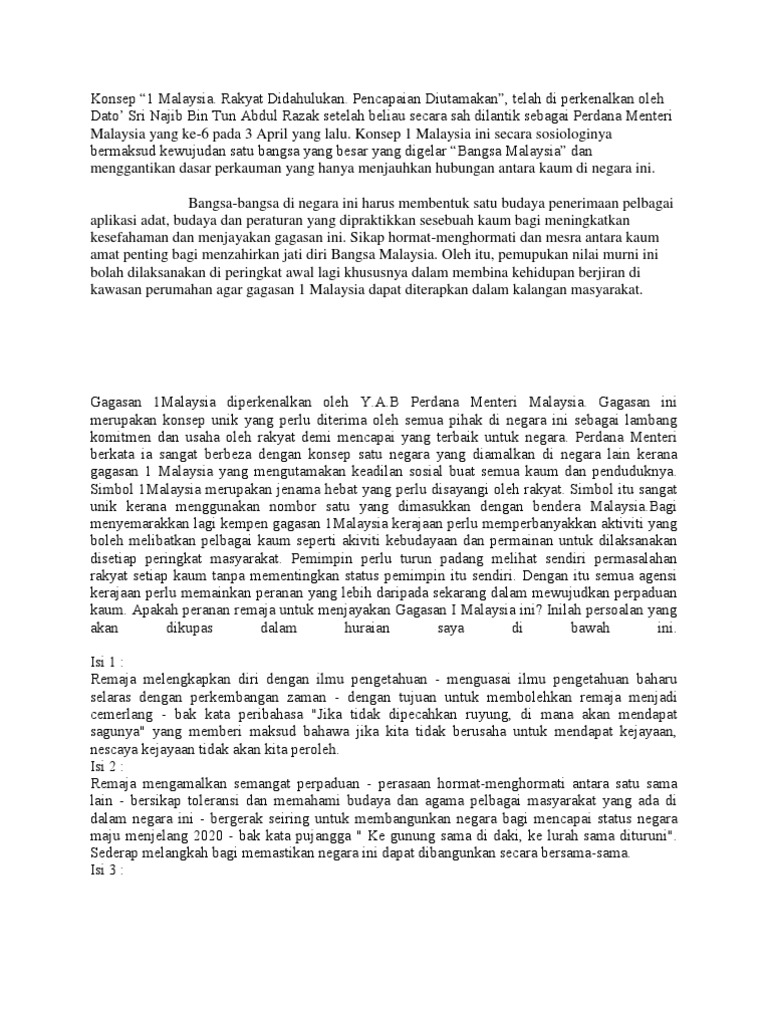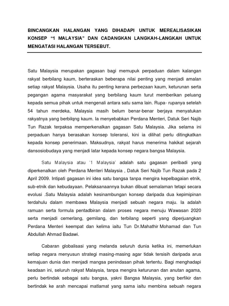 Cabaran Menjayakan Konsep 1 Malaysia from imgv2-1-f.scribdassets.com Cabaran dan langkah dalam menjayakan konsep 1malaysia. F14 mengamalkan konsep 1malaysia dalam kehidupan. Konsep 1 malaysia bukanlah 1 wawasan atau gagasan pemikiran baru. Beberapa cabaran dan rintangan termasuklah ketiadaan sumber fizikal dan kewangan seperti tiada ruang kerja lebih besar, berada di luar struktur organisasi pejabat, kurang sumber inspirasi. Cabaran dan langkah dalam menjayakan konsep 1malaysia. Dalam menjayakan gagasan 1 malaysia, proses penambaikan perlu ada. · menjayakan konsep 1 malaysia. Apakah kekuatan dan cabaran untuk merealisasikan konsep 1 malaysia?