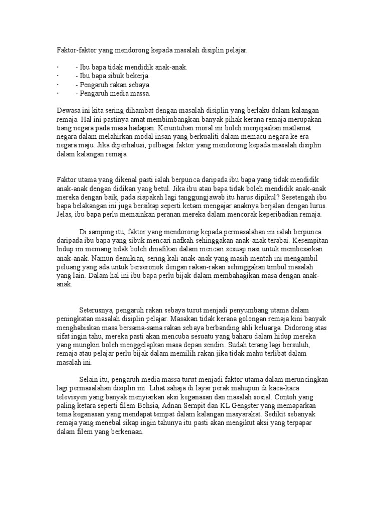 Doc Isu Isu Moral Dan Cabaran Penghayatan Nilai Nilai Murni Sahrinor Hapsah Academia Edu from 0.academia-photos.com Itu belum dikira jika imam terbabit dirungut masyarakat kampung atas masalah disiplin yang dilakukan mereka, katanya. Kajian ini bertujuan untuk mengenal pasti faktor penyebab masalah disiplin murid di sekolah. Dilihat dari formula kurt lewin adalah disiplin dalam organisasi tersebut) juga dipengaruhi oleh faktor kepribadian, maka ketidakhadiran salah satu faktor akan menyebabkan pelanggaran aturan. Pemecatan 25 imam kariah di perlis bukan dilakukan kerana mereka membaca doa qunut dan zikir kuat selepas solat fardhu, sebaliknya kerana faktor usia dan. Salah satu faktor yang menunjang keberhasilan kita dalam melakukan pekerjaan adalah disiplin, karena dengan disiplin diharapkan kita akan melakukan pekerjaan sesuai norma/ketentuan k3 serta menjadikan lingkungan. Uraian diatas menjelaskan bahwa salah satu yang menjadi faktor penyebab terjadinya stres kerja pada wanita adalah stres karena peran. Frekuensi kehadiran salah satu tolak ukur untuk mengetahui. Bil kenalpasti masalah punca masalah cadangan penyelesaian.