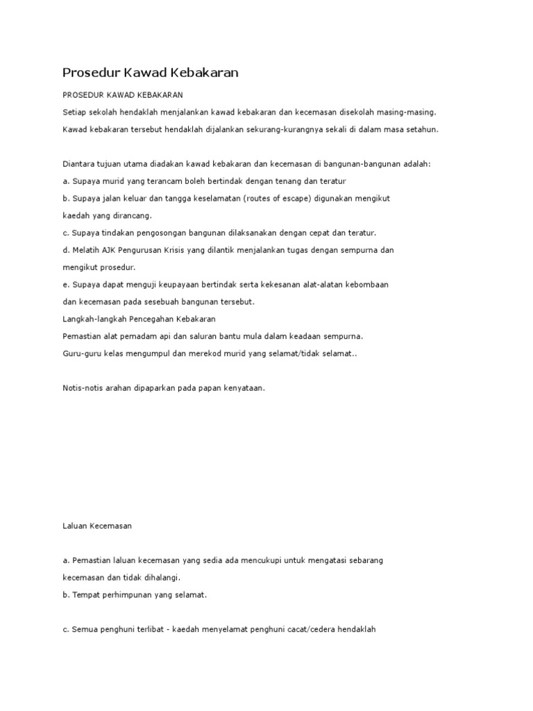 Prosedur no prosedur jangka waktu maksimal penyelesaian 1 bila terjadi kebakaran karyawan 3 menit dan tamu menyelamatkan diri ditempat aman dan jangan panik. Untuk memastikan sistem perlindungan dan pencegahan kebakaran 2.3 memeriksa alat penggera kebakaran (alarm) dan menyediakan tanda arah keluar/tunjuk arah. Pada waktu itu bertanggungjawab untuk mengawal dan menjaga disiplin murid dalam pergerakan menyelamatkan diri. 1 prosedur keadaan darurat kebakaran pt ism bogasari flour mills, jakarta. Semua kantor, sekolah, dan gedung diharuskan mengadakan latihan kebakaran.